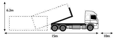 Placera liftdumpern så att det finns ett fritt luftutrymme på minst 6.3 meter vilket behövs för att lyfta upp liftdumpern på lastbilen.
